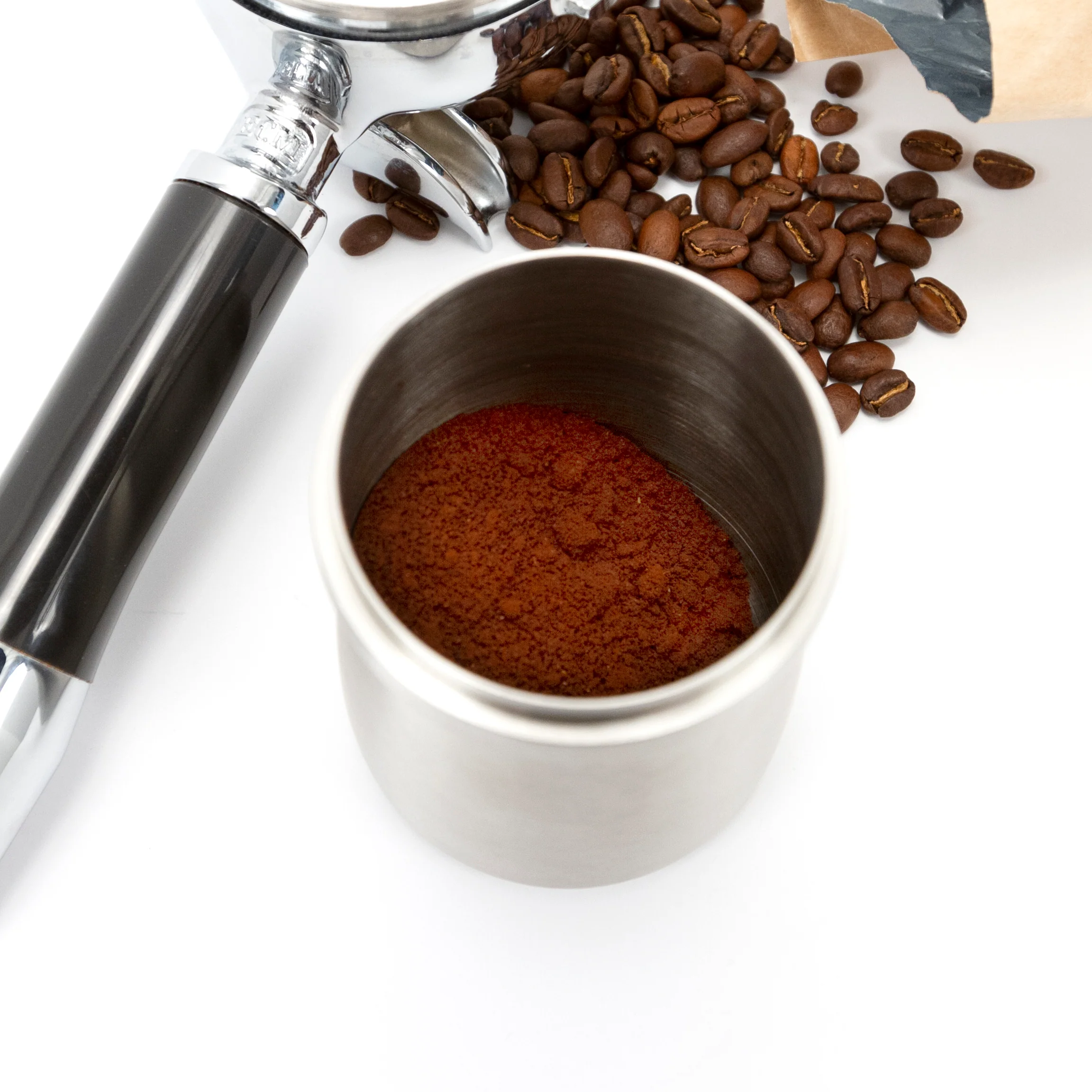 Designed for the simple and clean transfer of ground coffee from bulk coffee grinders like the Eureka Drogheria and Mahlkonig, the Acaia Dosing Cup is a clean, food-grade 304 stainless steel cup with an anti-static finish. With a total capacity of 85g, the cup is designed to fit 58mm portafilters and features a lip around the circumference for greater compatibility with grinders. The stainless steel construction is also rust resistant, making the cup an ideal choice for RDT spraying to eliminate static while grinding.
