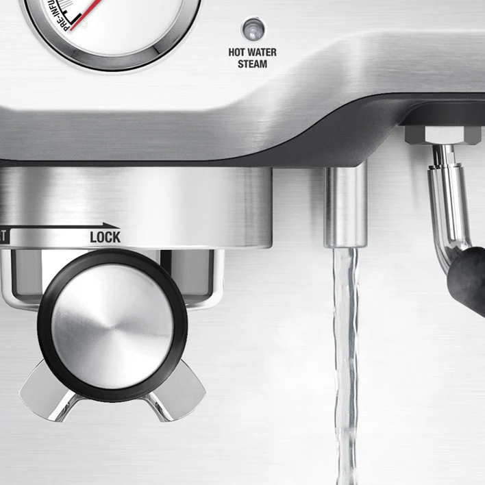 The Stainless steel 360° swivel-action steam wand stands ready to steam and froth your milk to turn your espresso shot into a latte or cappuccino. A purge function then automatically adjusts water temperature after using steam for optimal espresso extraction temperature for the next shot. A separate spout next to the steam wand delivers hot water on demand for tea or hot chocolate. Get your favorite espresso grounds ready and everything else you need to start making great espresso comes with the Breville BES840XL the Infuser Semi-Automatic Espresso Machine: Single & dual wall filter baskets (pressurized and non-pressurized), coffee scoop, stainless steel milk jug, cleaning disc & tablets, cleaning tool & allen key, water filter holder & filter. A removable 54mm tamper hangs out of the way magnetically next to the brew-head ready for instant access and storage.
