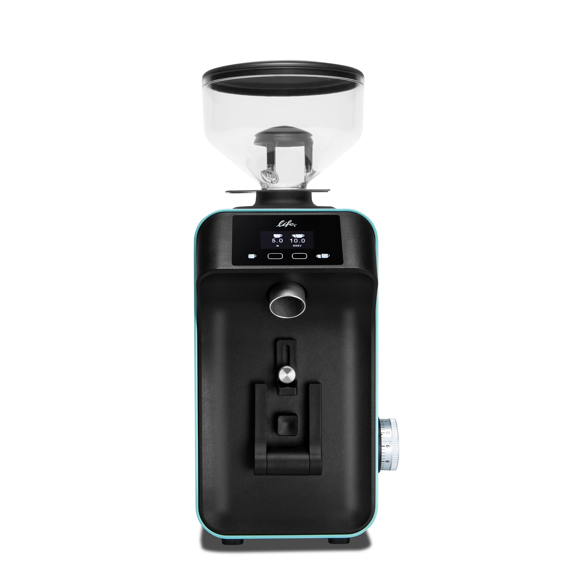 Grind adjustment is handled by a knob numbered between 0 and 9. One full rotation of the knob will navigate between the Life’s entire grinding range, making it easy to return to a desired setting. An adjustable hook and collapsible fork accommodate hands-free grinding into portafilters while the included 100g grounds bin allows for easy transfer to your desired brewing device. Programming is simple with a single and double dose that can be set for up to 60 seconds of grinding each within 0.1 seconds or you can switch to manual mode for freehand grinding.